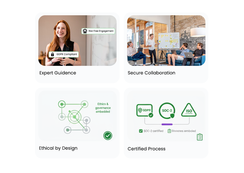 We build trust by embedding compliance, ethics, and governance into every step. From GDPR to SOC-2 and ISO readiness, Green Minds ensures every engagement is conducted to the highest global standards, giving clients confidence in risk-free insights.